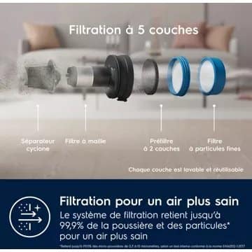 - Système de filtration : 5 étapes de filtration, les aspirateurs à plusieurs étapes de filtration permetttent d’aspirer jusqu’à 99,99% des particules et allergènes