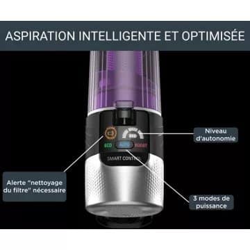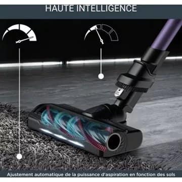 - Détail sur la puissance d’aspiration: : Elle peut varier en fonction du type de sols (parquet, carrelage, tapis, moquette) que vous aspirez et du mode utilisé (standard, éco, boost)