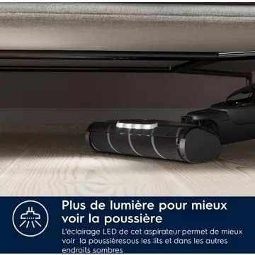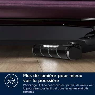 - Brosse motorisée avec éclairage LED : Elle s’adapte à tous les types de sols. Son éclairage LED permet de mieux voir la poussière et plus loin pour un nettoyage plus efficace