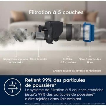 - Système de filtration : 5 étapes de filtration, les aspirateurs à plusieurs étapes de filtration permetttent d’aspirer jusqu’à 99,99% des particules et allergènes