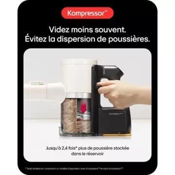 - Technologie d’aspiration : Multi-cyclonique : cette aspiration permet de traiter les grosses poussières ainsi que les particules fines grâce à ses multiples cyclones. Elle offre une force d’aspiration intense pendant toute la durée du nettoyage