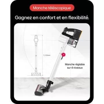 - Détail sur la puissance d’aspiration: : Elle peut varier en fonction du type de sols (parquet, carrelage, tapis, moquette) que vous aspirez et du mode utilisé (standard, éco, boost)