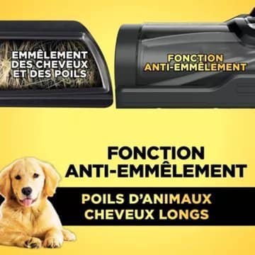 - Brosse motorisée avec éclairage LED : Elle s’adapte à tous les types de sols. Son éclairage LED permet de mieux voir la poussière et plus loin pour un nettoyage plus efficace