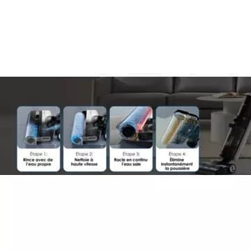 - Capteur de niveau de salissure : oui, adapte la vitesse de rotation du rouleau et le débit d’eau selon la salissure détectée
