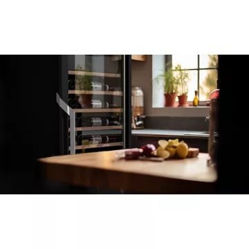 - Type de porte : vitrée, permet de visualiser facilement les bouteilles sans avoir à ouvrir la porte, ce qui réduit la circulation de l’air dans la cave et donc la variation de la température. Le traitement anti-uv protège le contenu.