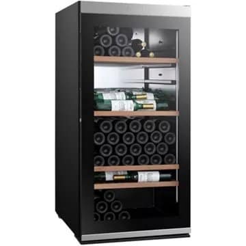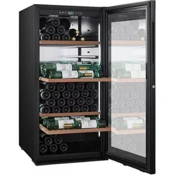 - Type de porte : vitrée, permet de visualiser facilement les bouteilles sans avoir à ouvrir la porte, ce qui réduit la circulation de l’air dans la cave et donc la variation de la température. Le traitement anti-uv protège le contenu.