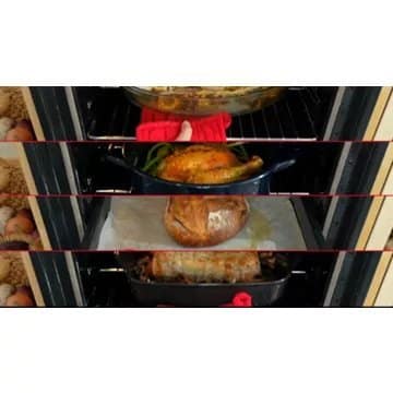 - Avantage de la chaleur tournante brassée : le four est équipé de 2 résistances , une en bas (sole) , une en haut (voûte) et d’une hélice placée au fond de la cavité qui permet de brasser l’air, pour une cuisson rapide et une repartition homogène de la chaleur.