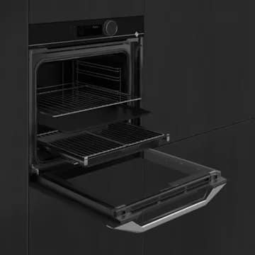- Rails téléscopiques : ils permettent d’accéder à vos plats en les faisant coulisser en dehors de l’enceinte de cuisson en évitant les risques de basculement. Vous pourrez arroser confortablement votre rôti ou retourner facilement vos plats sans risque de brûlure.