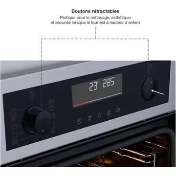 - Avantage des boutons rétractables : Les commandes peuvent être rentrantes pour le côté esthétique du four, pour le nettoyage et pratique au niveau sécurité lorsque le four est à hauteur d’enfant.