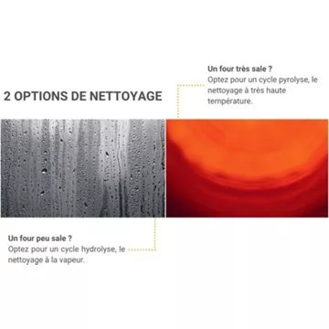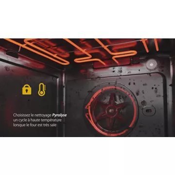 - Avantage pyrolyse : La température intérieure du four monte jusqu’à 500°C et détruit les graisses, vous n’avez plus qu’à récupérer les cendres à l’aide d’un torchon et le tour est joué !