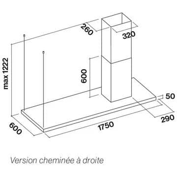 - Largeur : 175 cm, pour une zone de cuisson allant jusqu’à 120 cm de largueur.