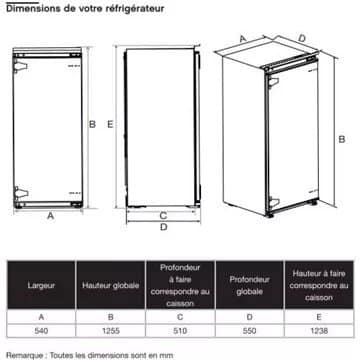 - Installation : porte sans débord, le réfrigérateur peut être installé contre le mur
