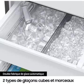 - Type d’alimentation d’eau : alimentation d’eau classique: L’utilisation de la fabrique de glaçon nécessite le branchement du réfrigérateur à une arrivée d’eau froide (le tuyau de raccordement est fourni)