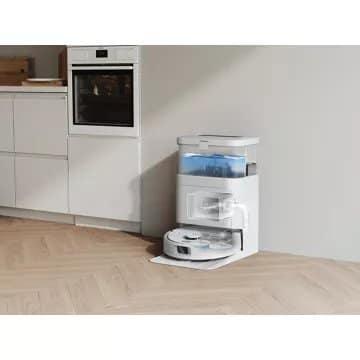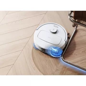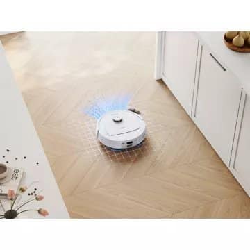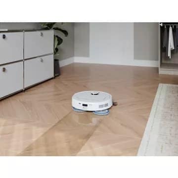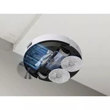 • Serpillière déportée : le robot est capable de nettoyer plus efficacement les angles et bords des murs en déployant sa serpillière vers l’extérieur.