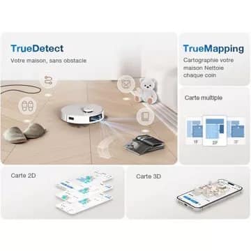 - Technologie caméra et laser : permet une cartographie complète et très précise des pièces. Grâce à ses caméras, ils analysent en temps réel ce qu’il a en face de lui pour améliorer ses prises de décisions et garantir son efficacité de nettoyage