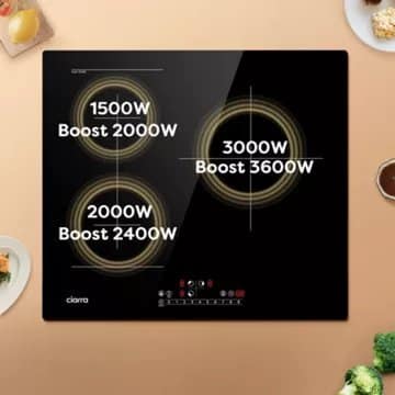 La CIARRA CD3BFBIH est une plaque à induction encastrable de 59 cm, puissante (6 500 W) et flexible grâce à sa Flexizone. Elle convient aux familles ou utilisateurs multi-plats grâce à son agencement 3 foyers, ses fonctionnalités de sécurité complètes et ses minuteurs indépendants. Son nettoyage est aisé via une surface vitrocéramique élégante. Elle est bien adaptée aux cuisines modernes recherchant efficacité, sécurité et adaptabilité.