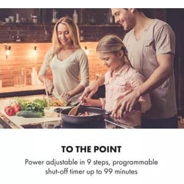 - Sécurités : arrêt automatique, anti surchauffe, verrouillage du clavier, témoin de chaleur résiduelle, détection d’absence de récipient, témoin de mise sous tension