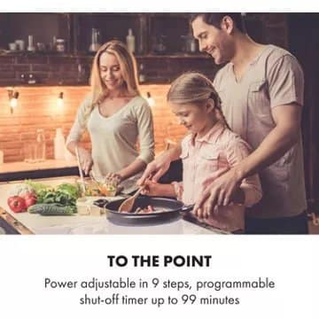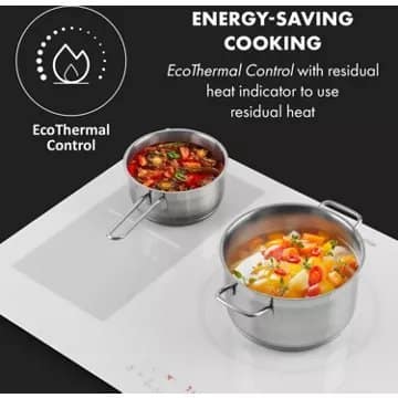 - Sécurités : arrêt automatique, anti surchauffe, verrouillage du clavier, témoin de chaleur résiduelle, détection d’absence de récipient, témoin de mise sous tension